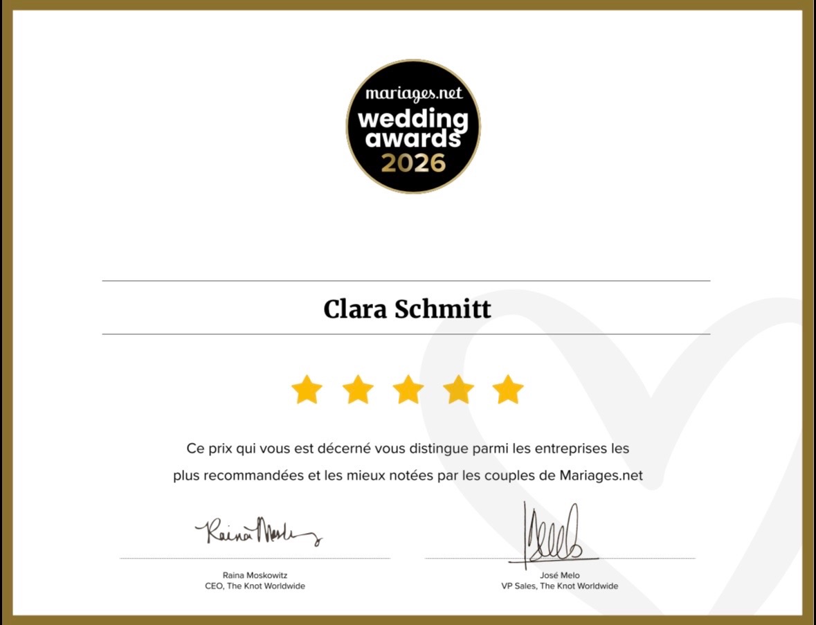 J’ai également eu la chance de remporter le wedding awards mariage.net 2024 avec une trentaine d’avis positifs.